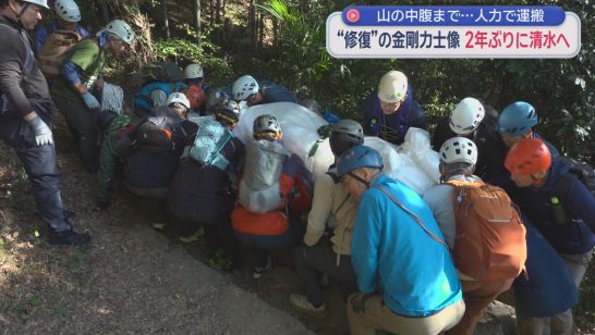 金剛力士像が2年ぶりに帰還 重機が使えず1体200キロの金剛力士像を25人がかり...